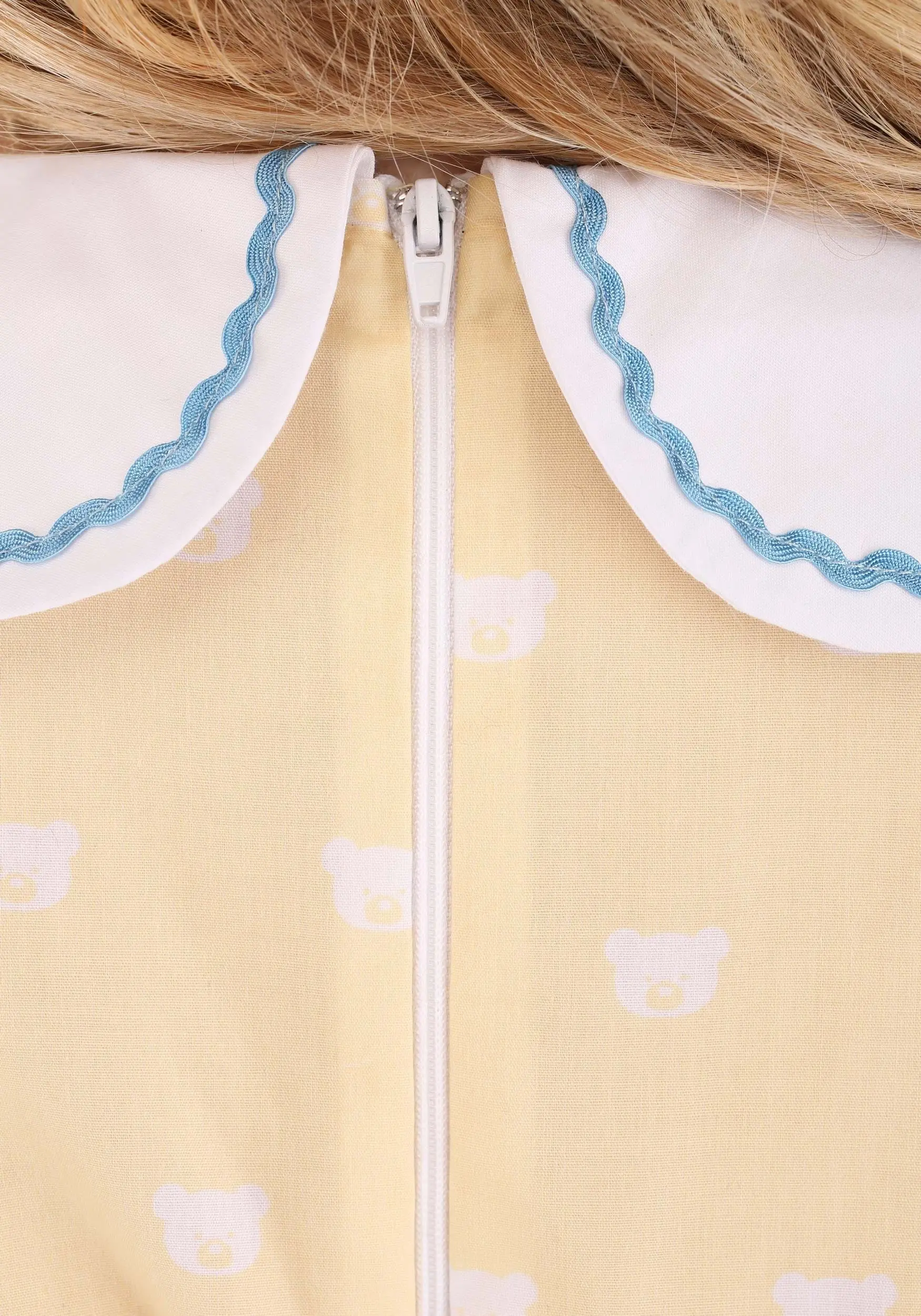 - Sheer ruffled edging at sleeve cuffs, hemline & apron