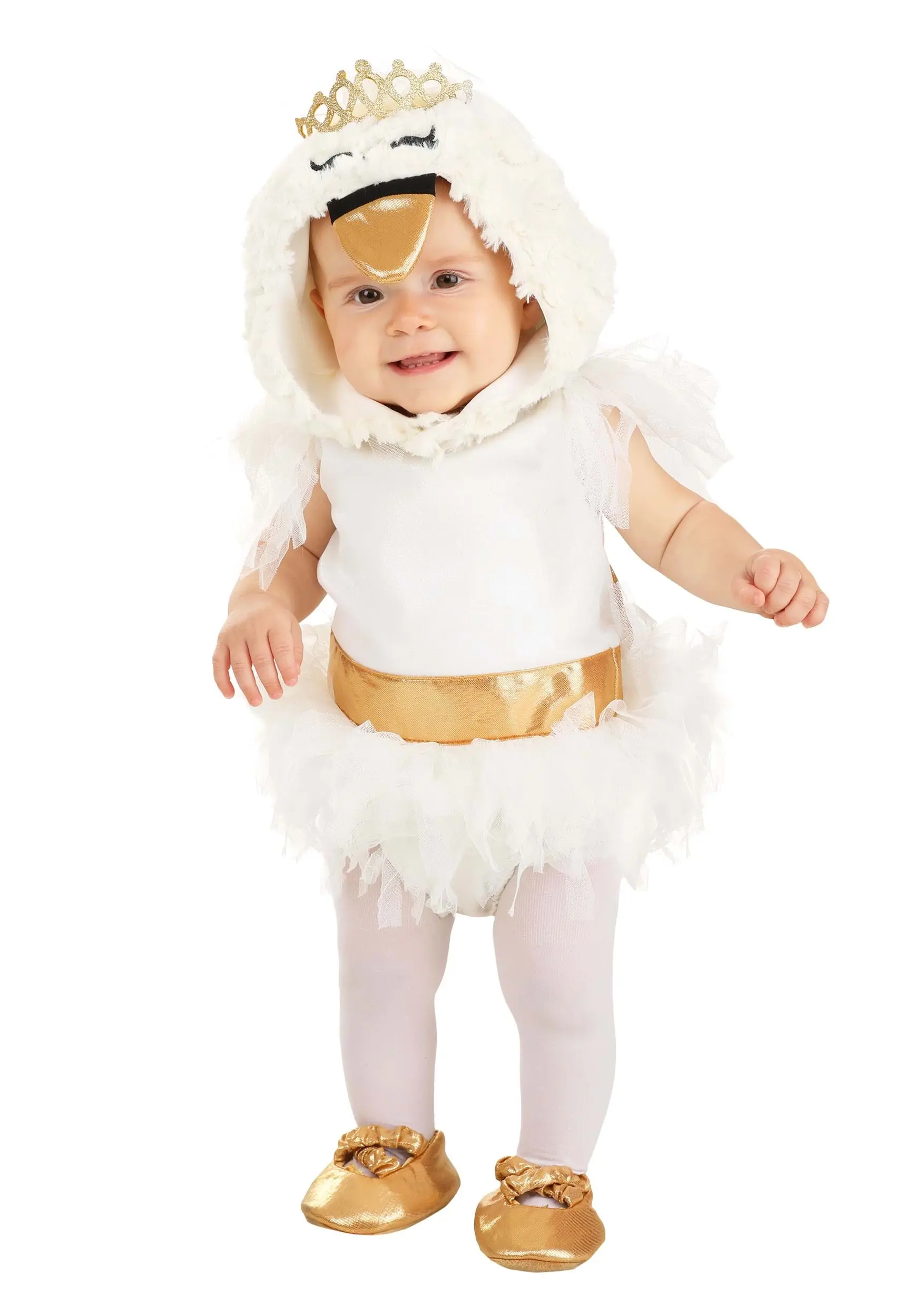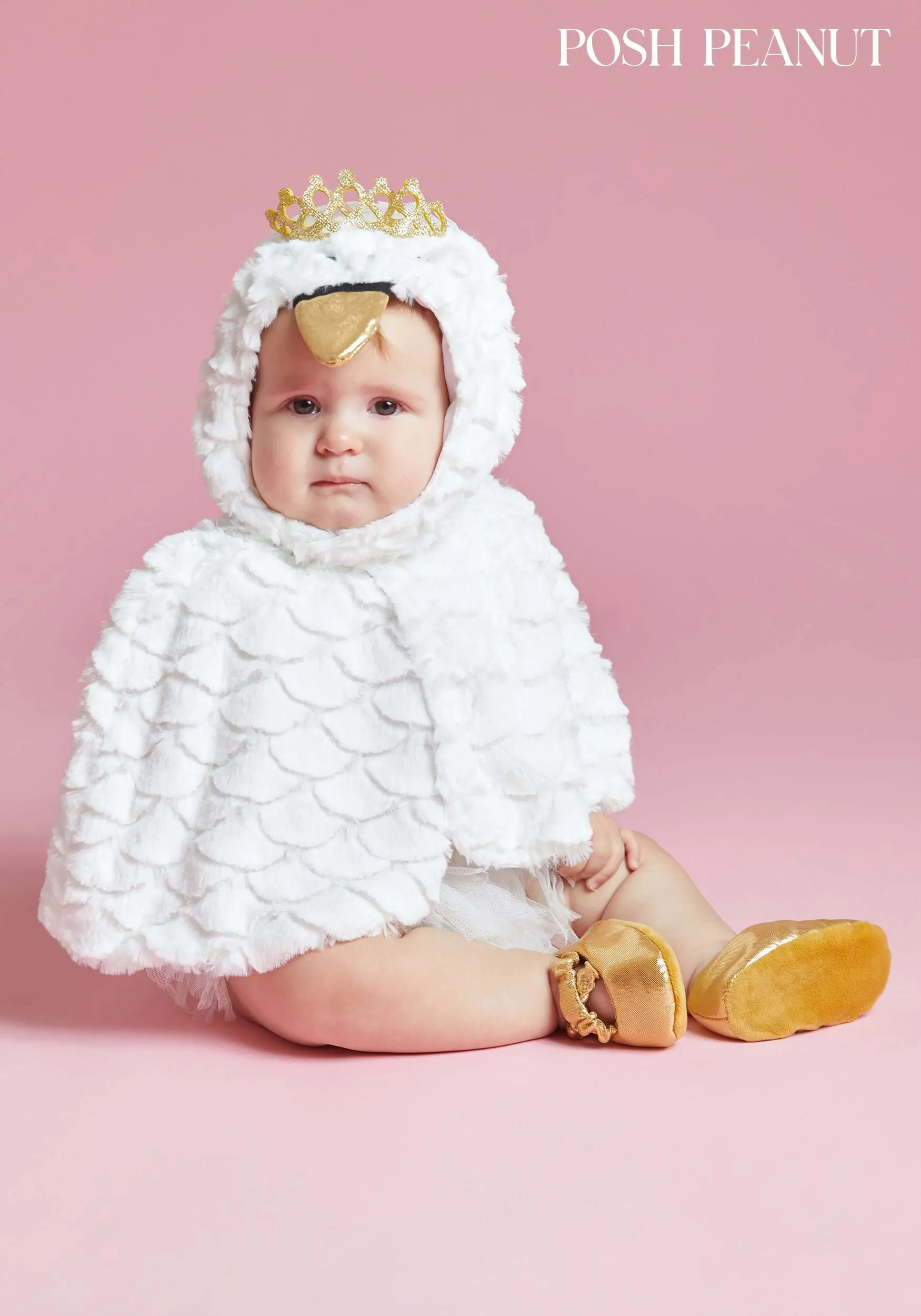 Whether your peanut is quiet as can be or can rattle the rafters with their singing voice, they’ll be cozy and cute in this Posh Peanut Infant Odet Swan costume. The ballerina romper has tulle on the shoulders as well as the skirt. (It features snaps for quick changes, too!) The belt brings in some shine thanks to the gold accent that matches the bright booties. Your peanut can look precious in their little dress or you can make them the star of the show with the Odet Swan cape and hood. They are both plushy soft with feather-like details and the hood features a bright gold beak and crown as well!