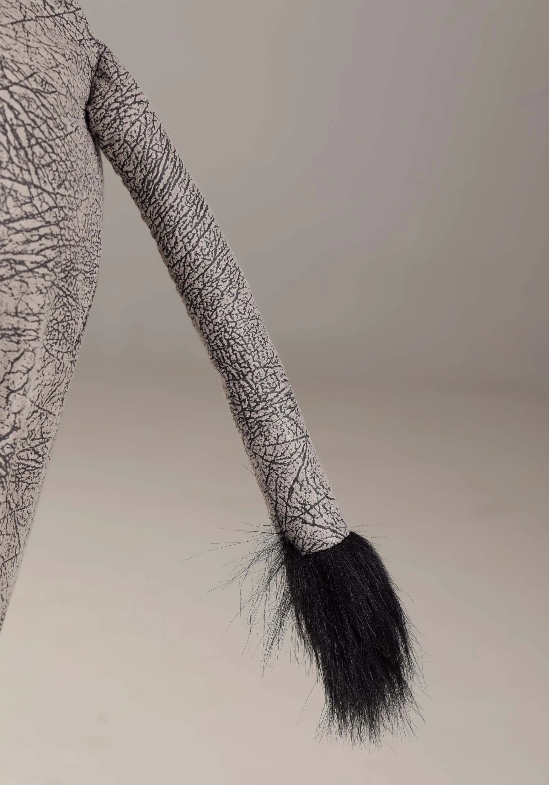 - Sewn on stuffed tail has faux fur on the end