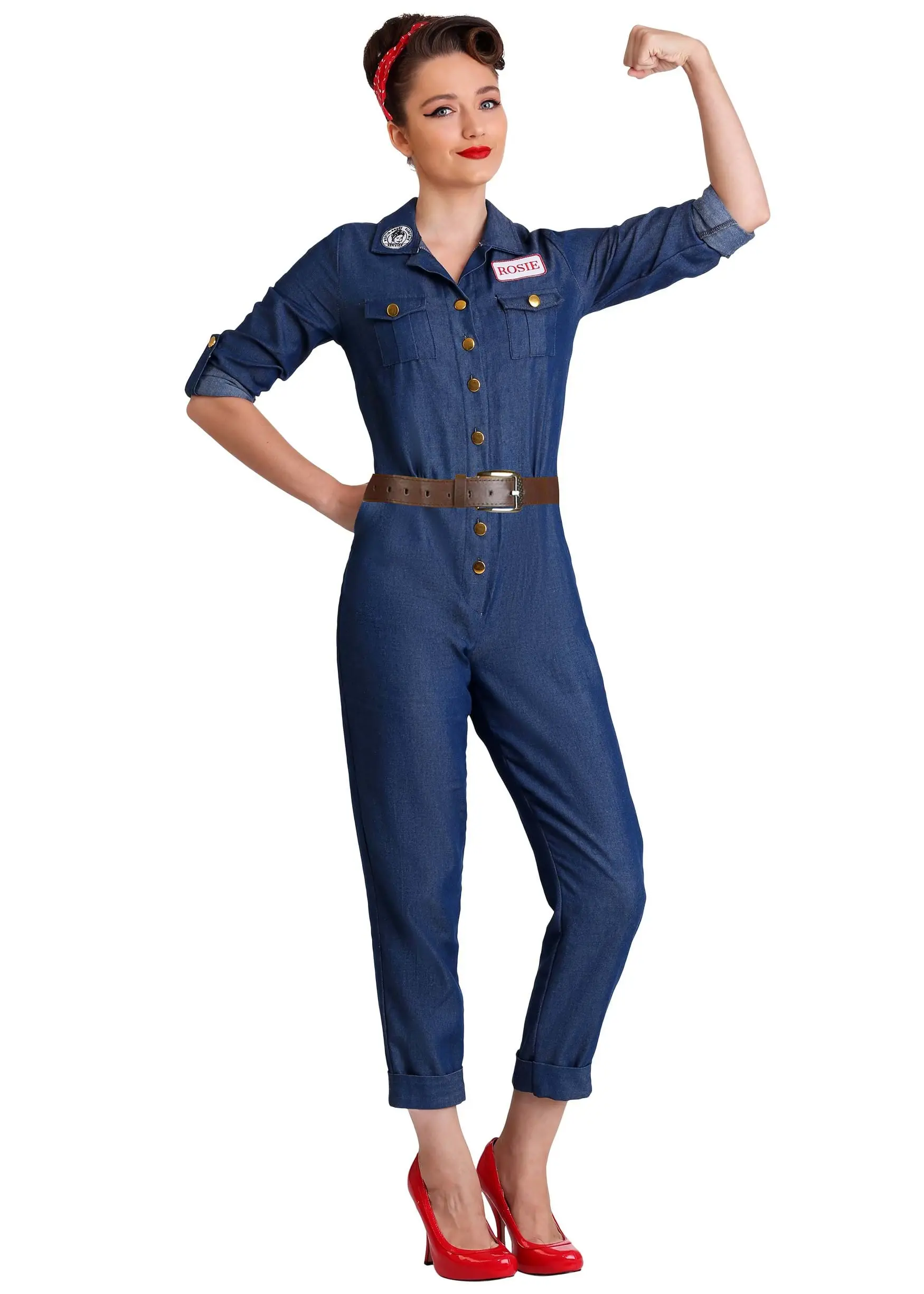 Ready to balance grit with glamour? Our Made by Us World War Two Icon costume is a fashionable interpretation of the inspirational posters that were popular during the height of the war effort. Our in-house designers put together a sleek jumpsuit made of denim fabric that can easily be worn with heels or boots. The jumpsuit buttons up the front and has functional side pockets at the hips as well as gusseted breast pockets for a fully functional look. The costume is polished off with the faux leather belt and iconic red bandana, leaving you looking riveting right off the bat.