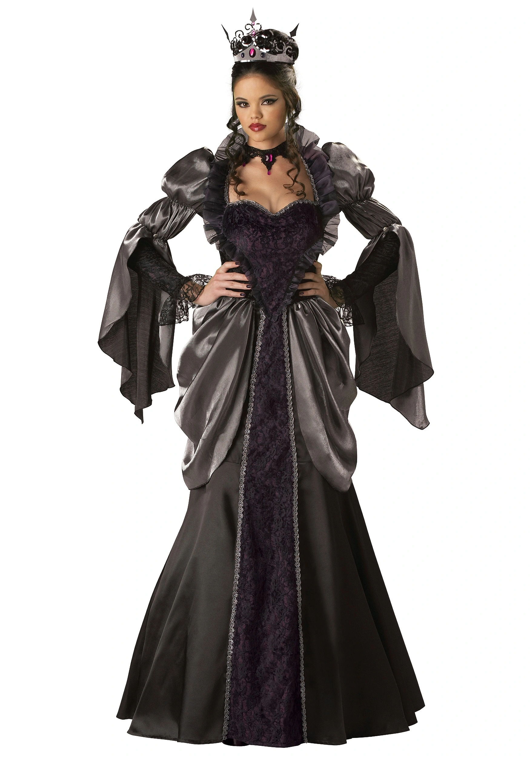 Rule #2: all black everything all the time. So if you are feeling a little wicked, or you know you’ve got the quality somewhere deep down and would like to tap into it, try slipping into this Plus Size Wicked Queen Costume. Your long-pointed draped sleeves and lacy jeweled necklace will strike fear in the hearts of the pure, and the black and purple will inspire devotion from those down with the wickedness. Remember what we said about wickedness when you’re out on the town. Be it an accidental side-eye, an overt insult, or a usurper to your throne, no meddling may go unpunished!